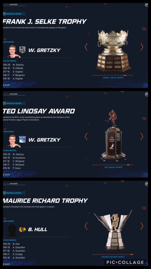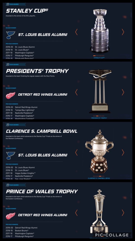 The All-Time teams available in the game are a group of 4: All-Time All-Stars, East, West, and Grit. Due to lack of numbers and parity reasons in regard to it being an Alumni simulation, they were left off. However, there can be a sim for them within the near future in some capacity. Some players within the Alumni teams overlap due to playing for multiple franchises and relocation of franchises to modern day teams. There will be many doppelgängers, i.e. three Wayne Gretzky’s (STL, LAK, NYR); 3x the GOAT! We’ll take a look at the End of Season Power Rankings, Season Award Winners, and of course Alumni-Stanley Cup Champions.